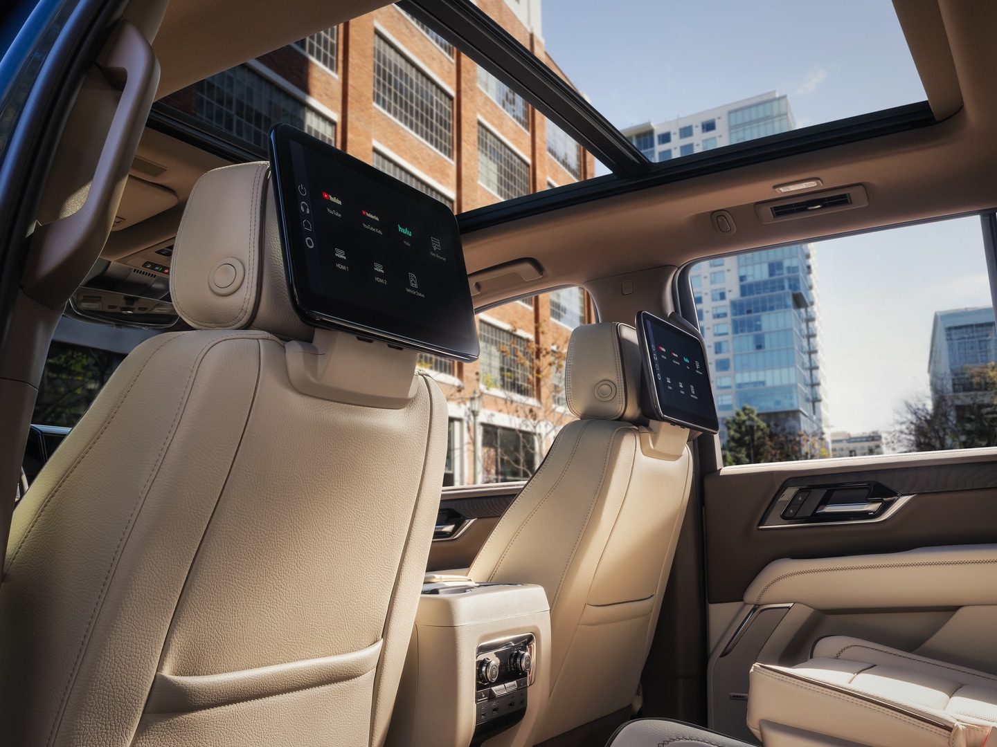 The spacious cabin offers seating for up to nine passengers, ensuring that everyone can travel in ultimate relaxation. The meticulously crafted interior features premium materials, including perforated leather-appointed seats, which create an atmosphere of refined sophistication. The heated and ventilated front seats offer year-round comfort, while the tri-zone automatic climate control system enables front and rear passengers to individually customize their temperature preferences for optimal comfort.